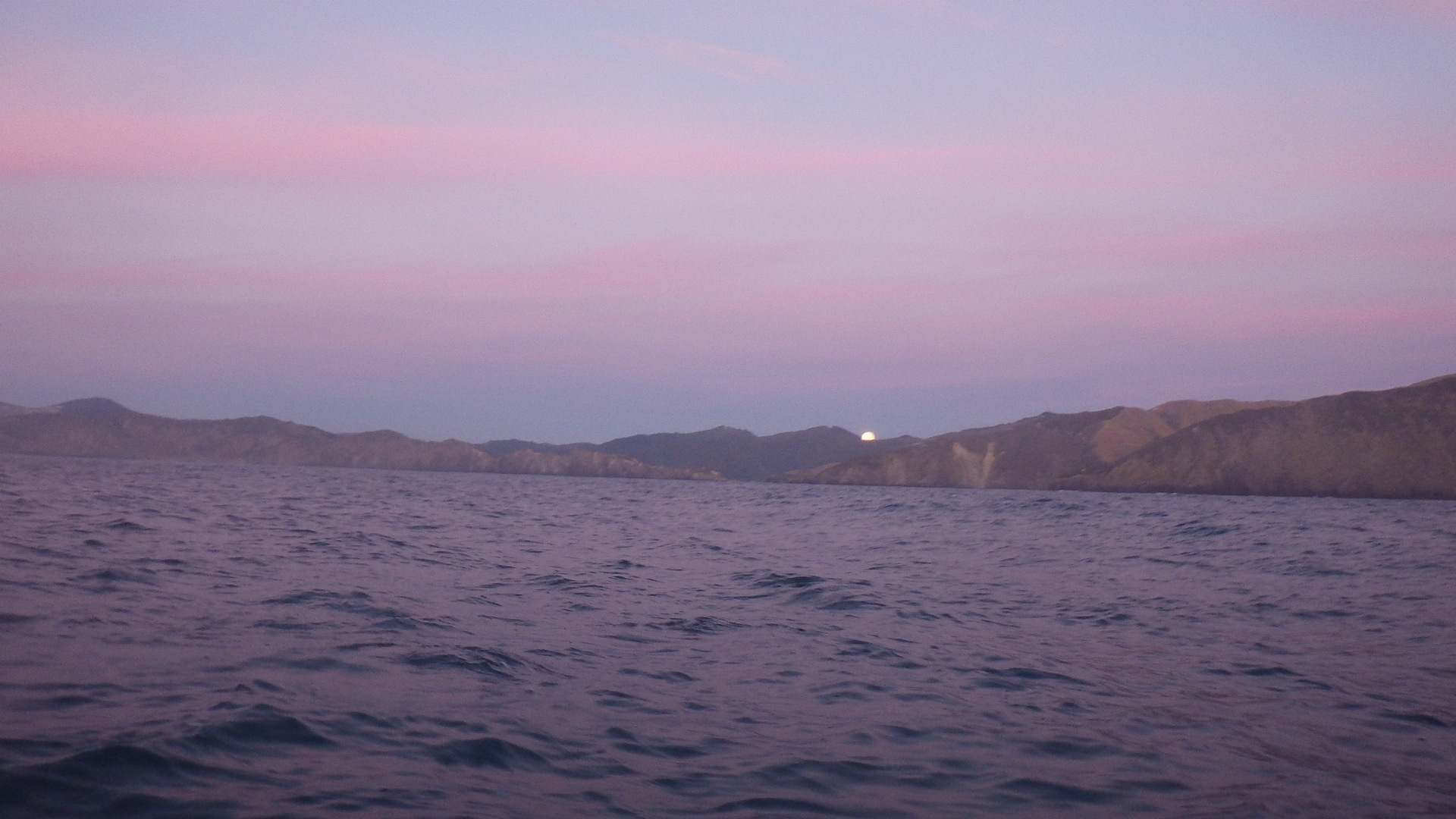 After eating we bedded down for a few hours around midnight to wake up at 4.30am. Not a great sleep but just good to be horizontal and not paddling for a few hours. As you know (or if you dont) you should go out and see the full moon, its beautiful and the same one we had monday evening and into the dawn on Tuesday morning. We were packed in our kayaks and paddling again by 5am. Summer is fading here so still really dark at this time in late Feb. The moon was wonderful and provided great light to help us see what was perhaps the scariest part of the whole journey.Getting out of Tori Channel and into Cook Straight.