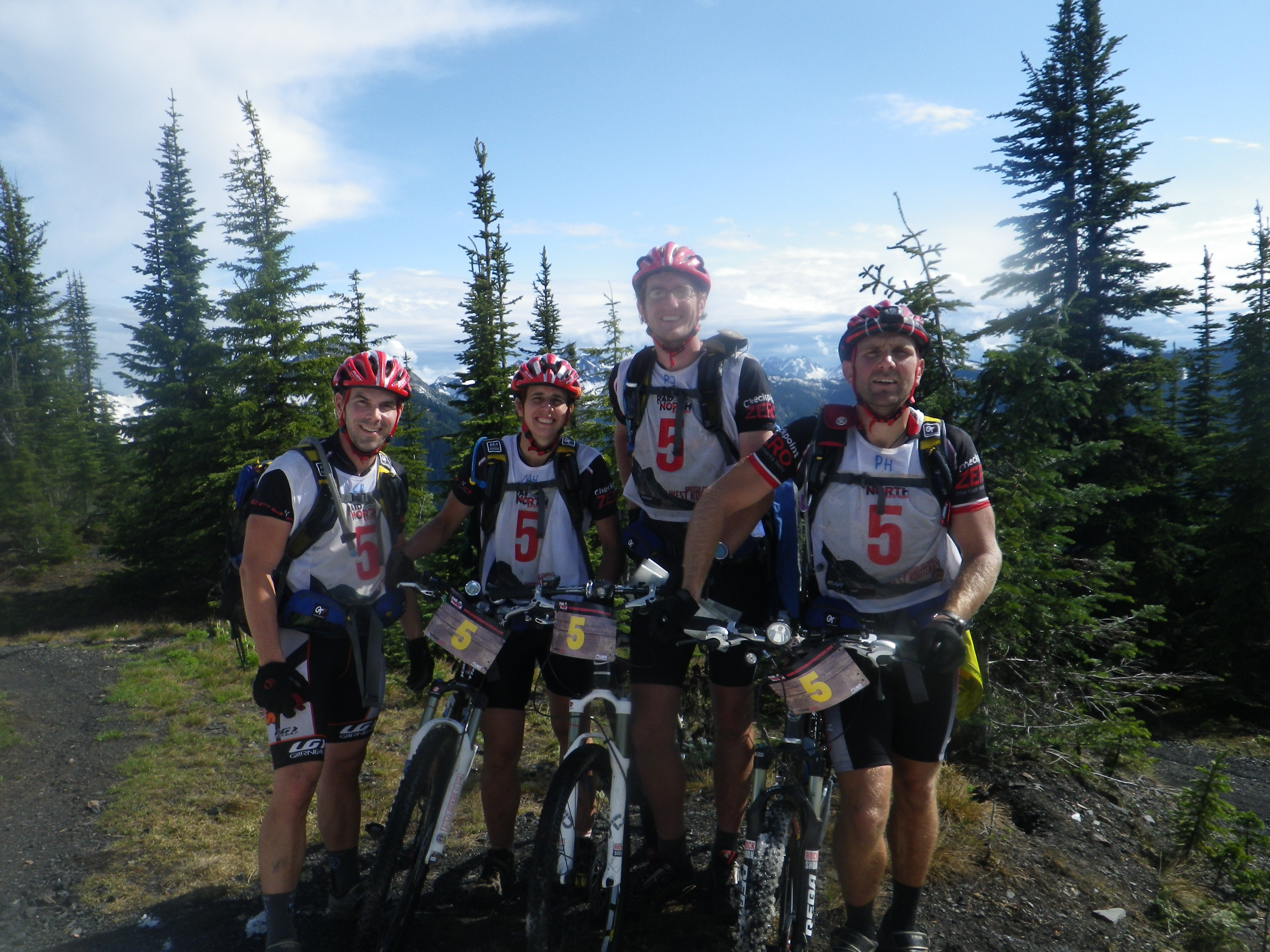 We left the TA on foot, with our good friends Team WEDALI and immediately begin biking up a steep road. WEDALI stopped because their female team-mate was having some breathing/asthma problems., we kept going, up & up. Soon more clouds rolled in and this time the rain was for real. Jackets on & riding up this mountain in the rain, but relatively comfortable. Past another CP and eventually to the summit of this mountain by the same road. By now the rain had stopped and sun had come out. WEDALI didn’t catch up but we were joined by a race photographer as we leaped froged each other for the last hours biking to the summit of this mountain. He snapped our pic at the top as you can see here