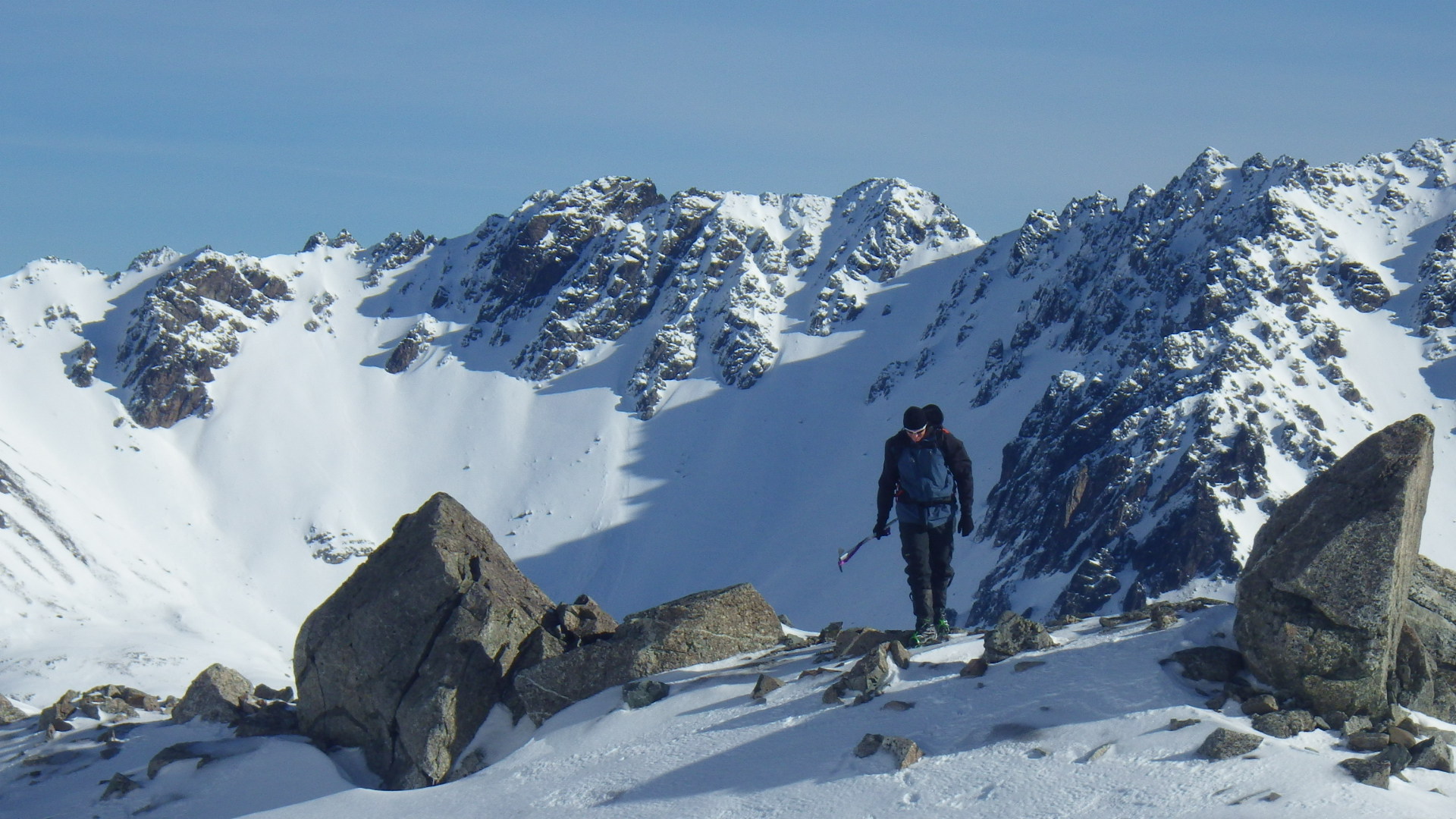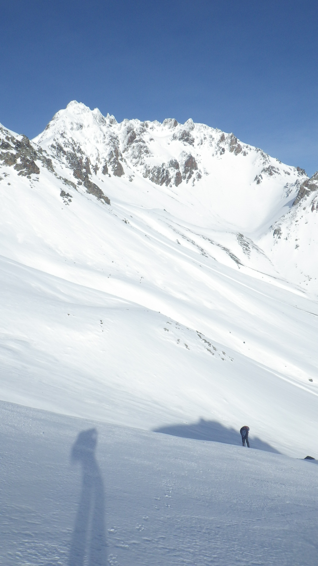 As we got closer to the summit we had to pass under a big head wall of rock and ice. By now the sun was on it and combined with the now very strong winds was beginning to fling chunks of ice off and have them hurtling now the slope at us.